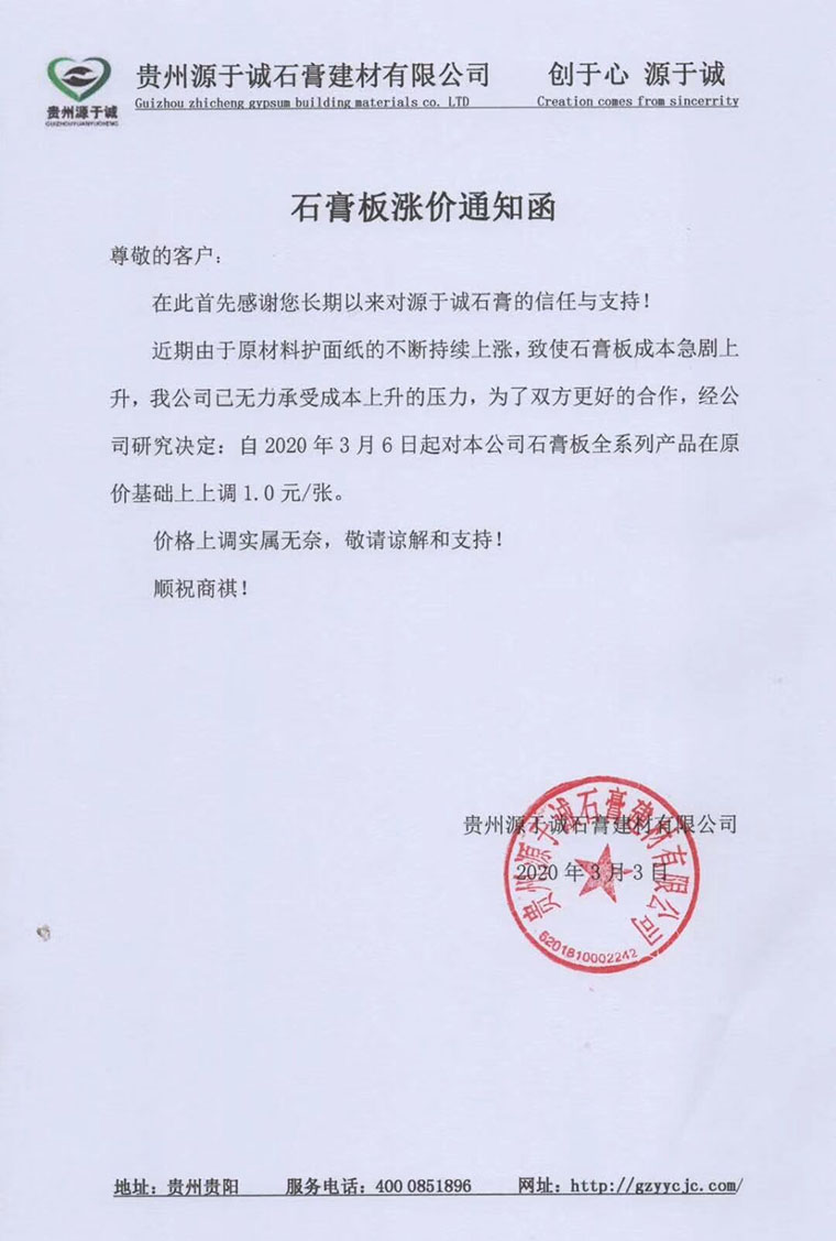 石膏板漲價(jià)通知函